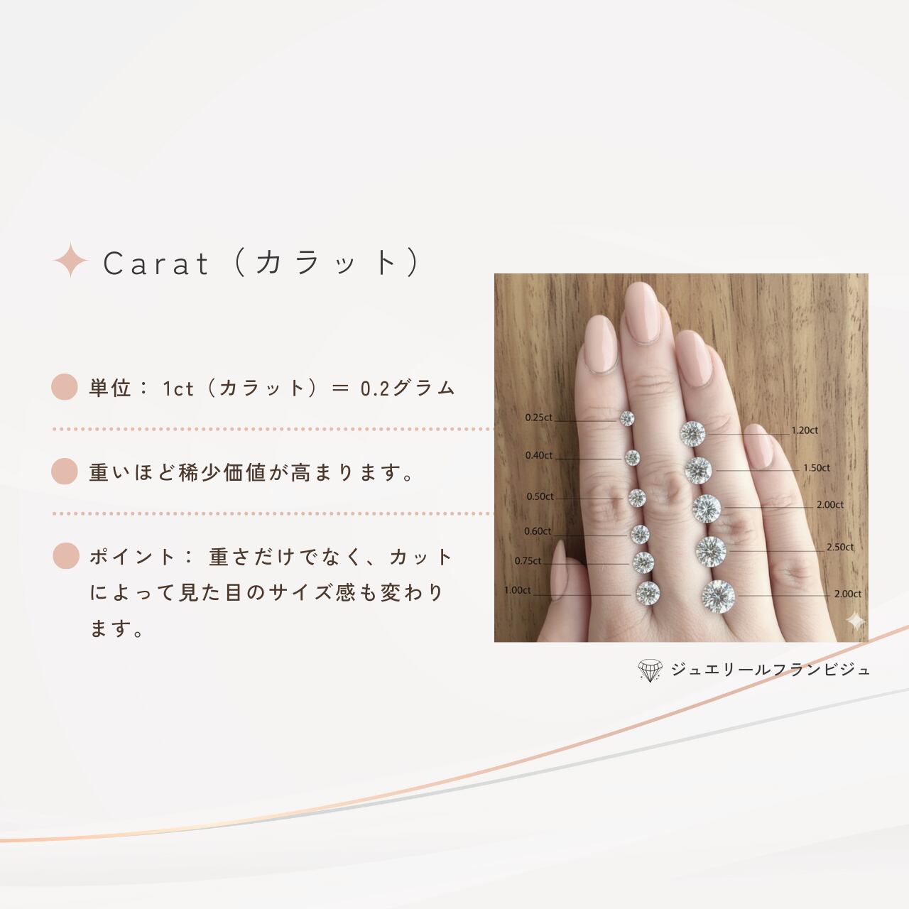 3つのこだわりポイント【0.342ct Eカラー】トップクラスの透明感と輝きメインダイヤモンドは、ほぼ無色透明の最高級グレードEカラーと、優れた輝きを引き出すVG(Very Good)カットを採用しています。0.342ctという存在感のあるサイズで、手元を華やかに演出します。