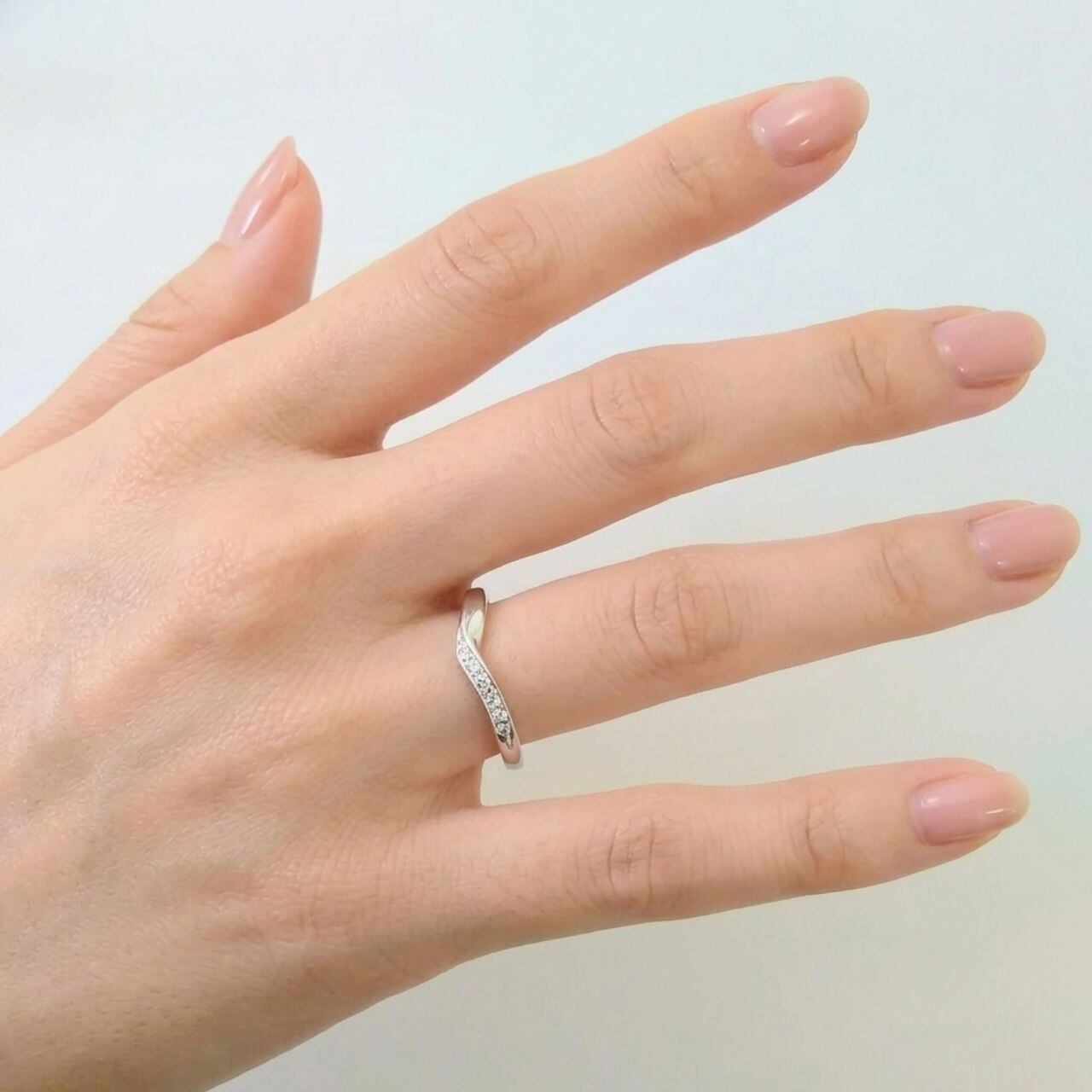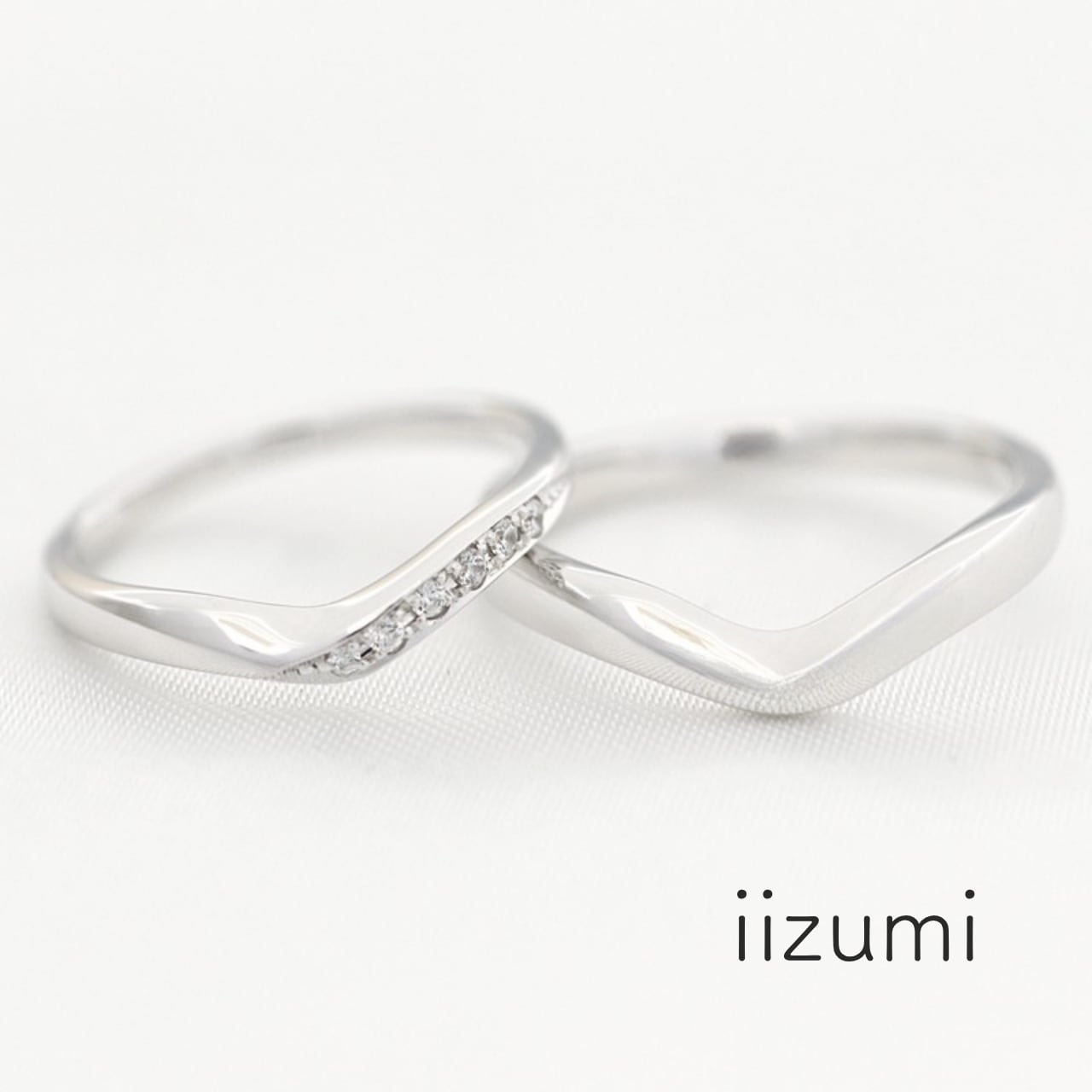 iizumiは深めのVラインが特徴的なリングです。レディースデザインはVラインの半分に沿って美しいダイヤモンドが埋め込まれており、指が長くの美しく見えるデザインです。