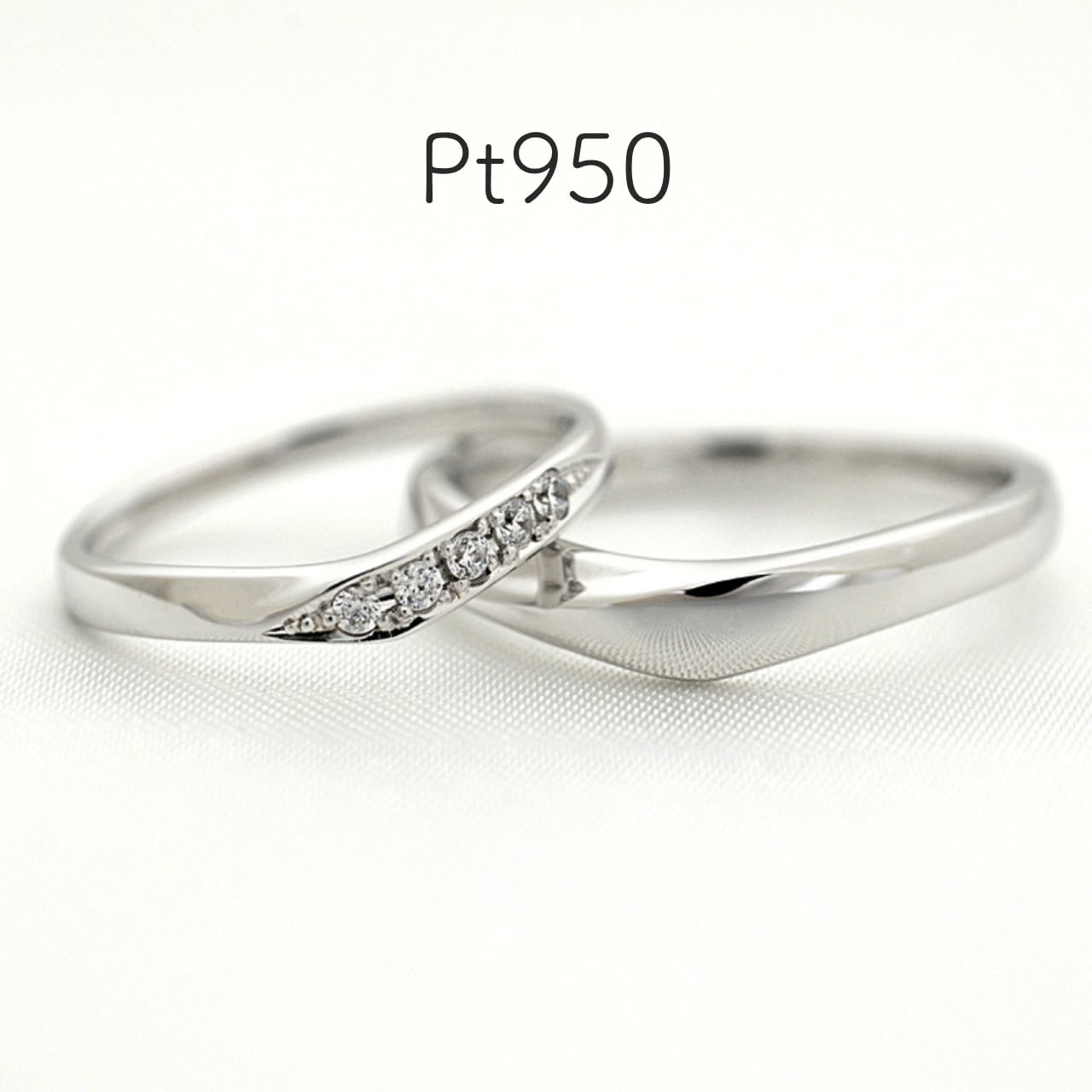 女性用のリングには、指を長く美しく見せるVラインに沿って、5石のダイヤモンドが上品に煌めきます。男性用は優しい雰囲気ながらも逞しさもあるボリューム感があります。
