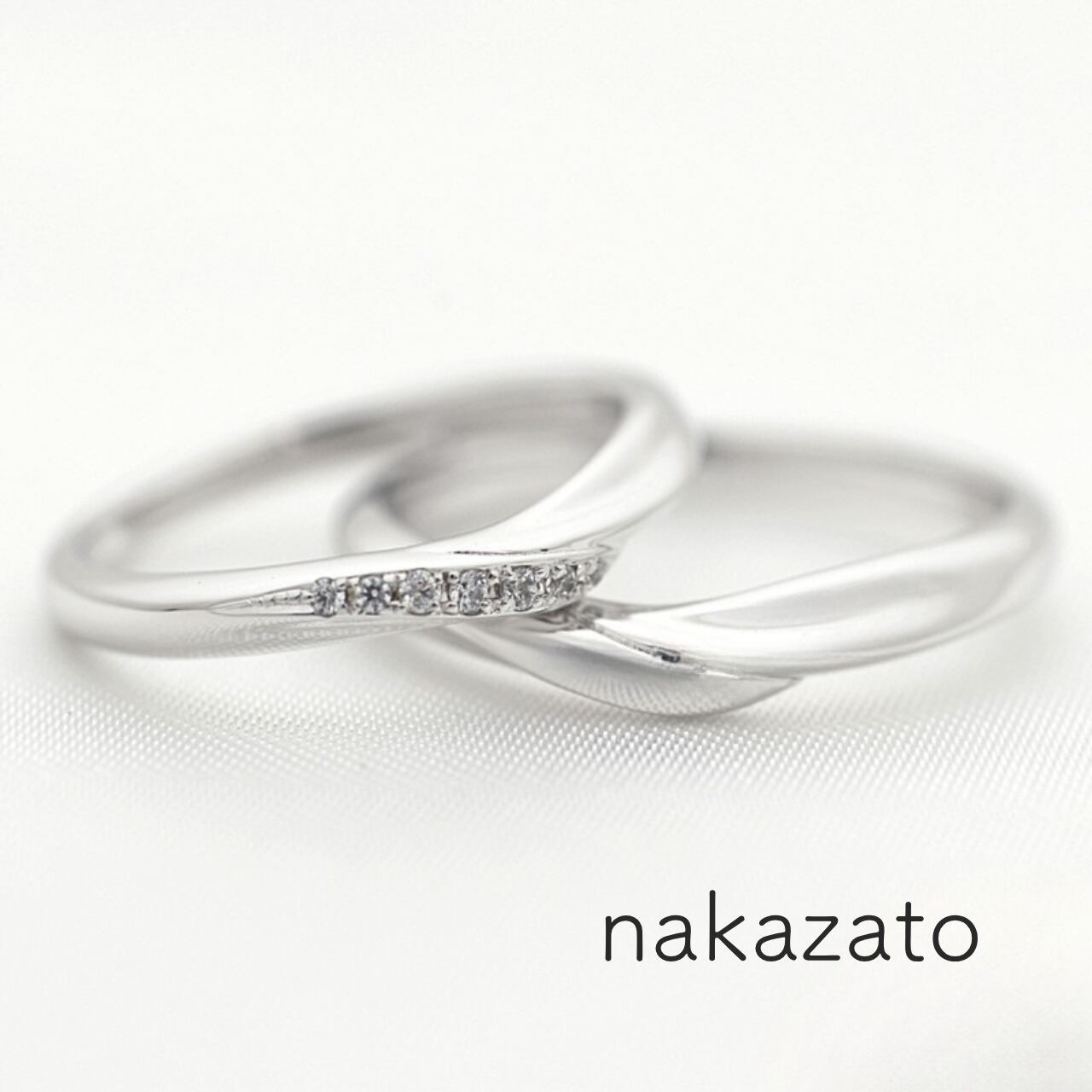 流れるような美しいラインのリングです。レディースデザインには6石のダイヤモンドがキラキラと輝きます。センター部分は地金がふんわり重なり合い、柔らかく優しい雰囲気のデザインです。飽きの来ないシンプルなデザインと着け心地の良さが特徴の「nakazato」。