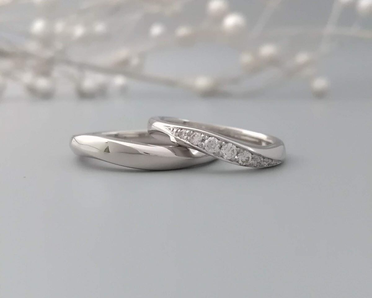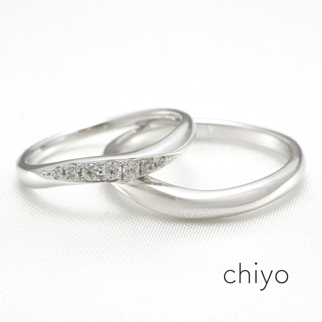 chiyoは緩やかなウェーブが優しい雰囲気を醸し出すデザインのペアリングです。レディースデザインには美しいダイヤモンドがグラデーションにセッティングされ女性の指先の美しさを最大限に引き出します。